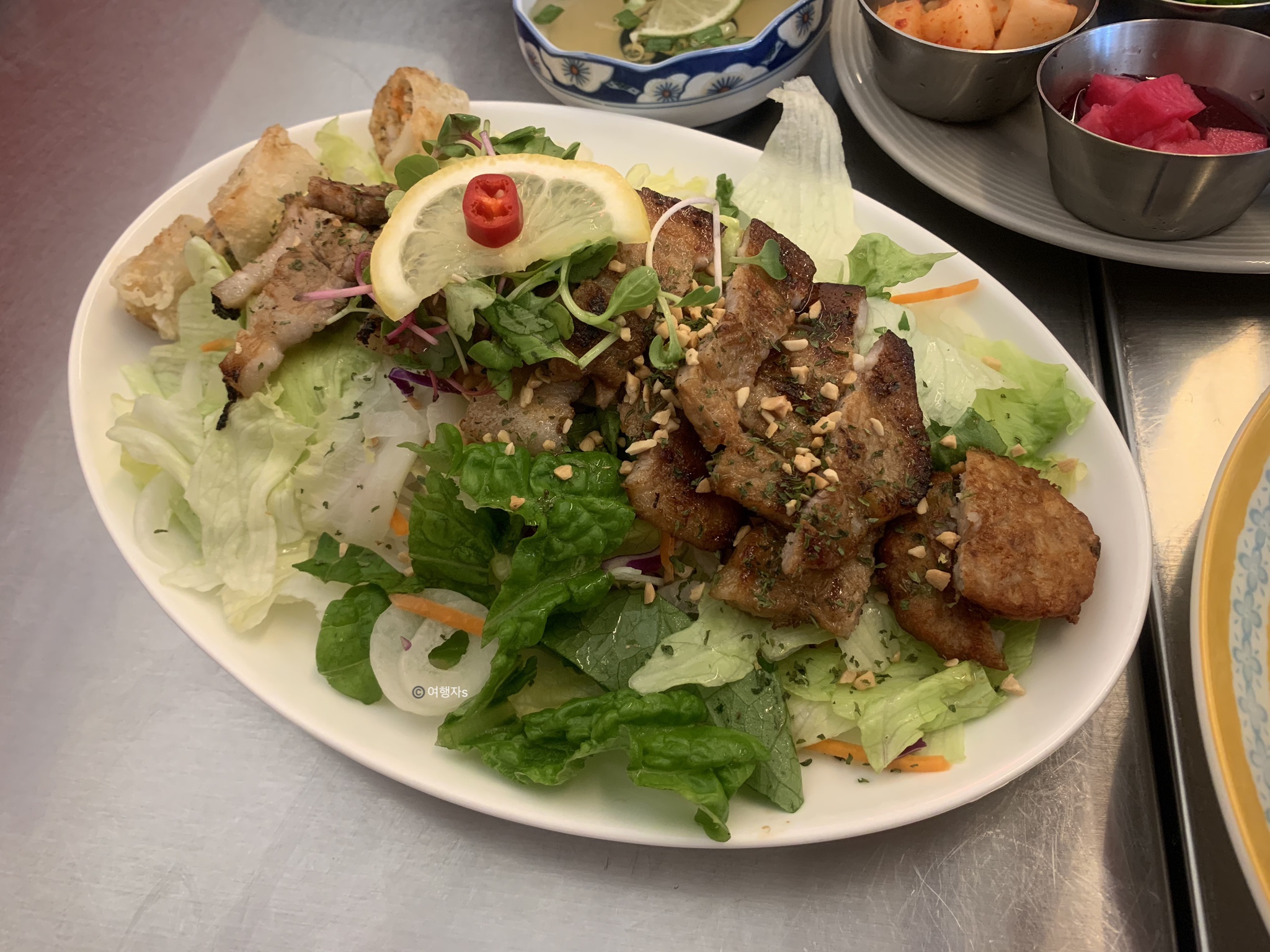 싱싱한 야채위에 노릇노릇하게 잘 구워진 고기, 그리고 짜조까지! 야채아래에는 면도 숨어있지요!